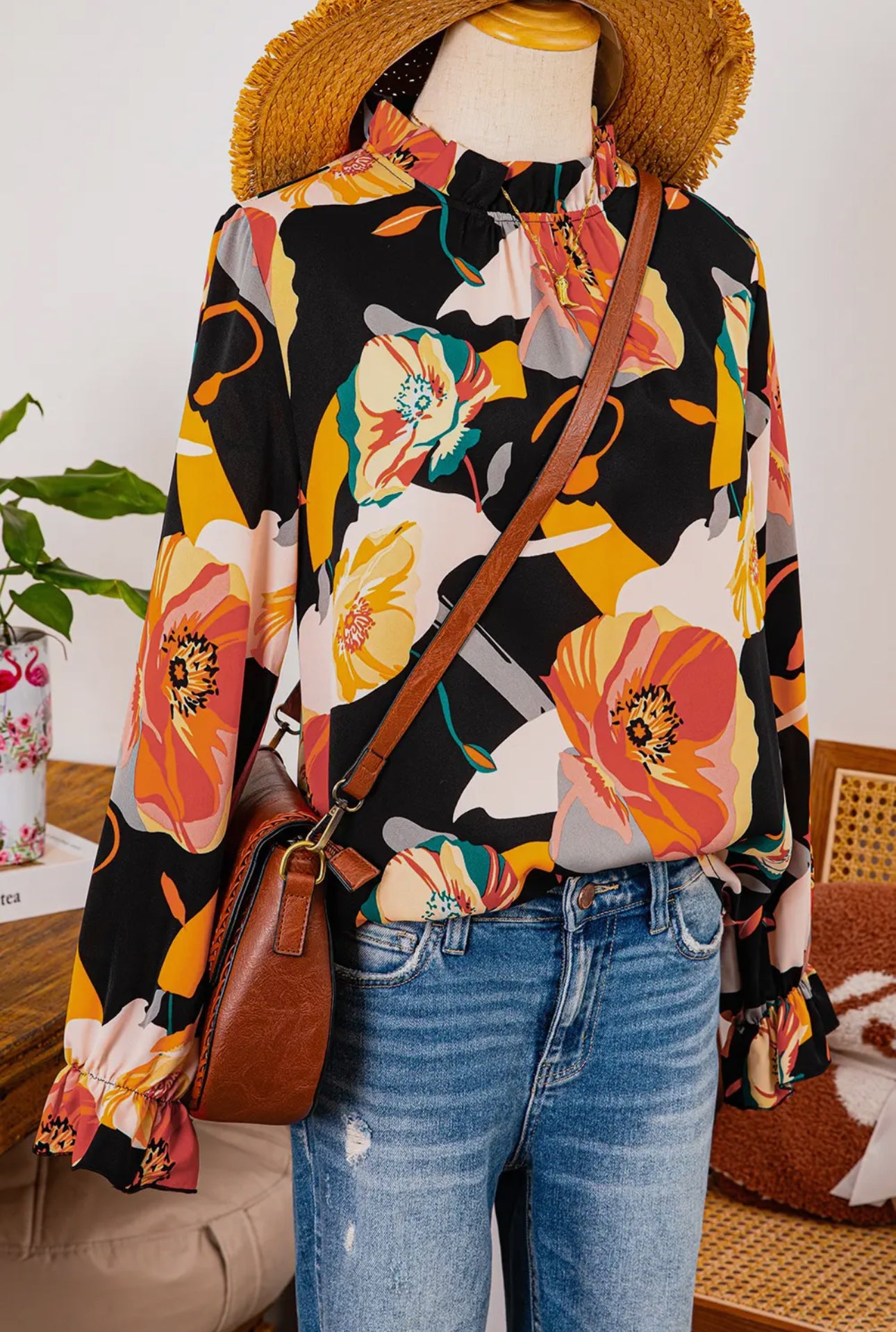 The Spain in the Sun Top is crafted from a lightweight and soft fabric, featuring striking bold orange flowers highlighted with vibrant black and gold. Its long sleeves offer a graceful silhouette, merging bold design with comfortable wearability—ideal for adding an elegant statement to any wardrobe.