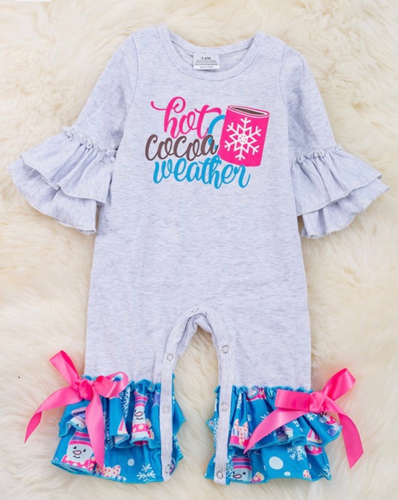 Baby girl romper - Hot Cocoa Weather grey with blue and pink ruffles